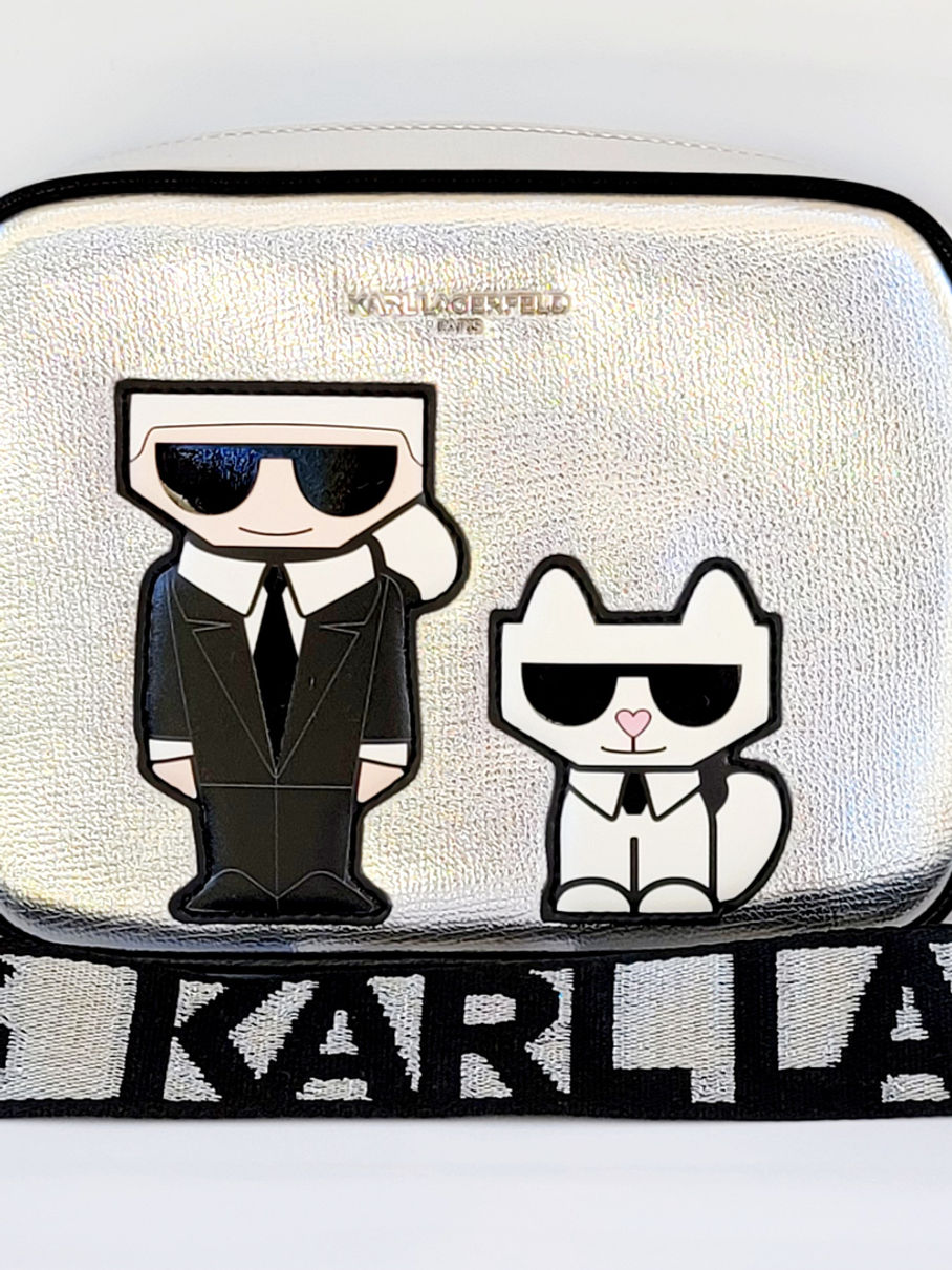 Noste s sebou nejstylovější duo módního světa: Karla a jeho kočku Choupette. Tato hravá crossbody kabelka je dokonalým ztělesněním odkazu slavného návrháře, který kombinuje humor s nadčasovou elegancí. Zářivý metalický povrch ve stříbrné barvě dodává modelu futuristický nádech, zatímco široký textilní popruh s logem přináší moderní, street-stylový komfort. Ideální doplněk pro ty, kteří se nebojí ukázat svou osobnost.