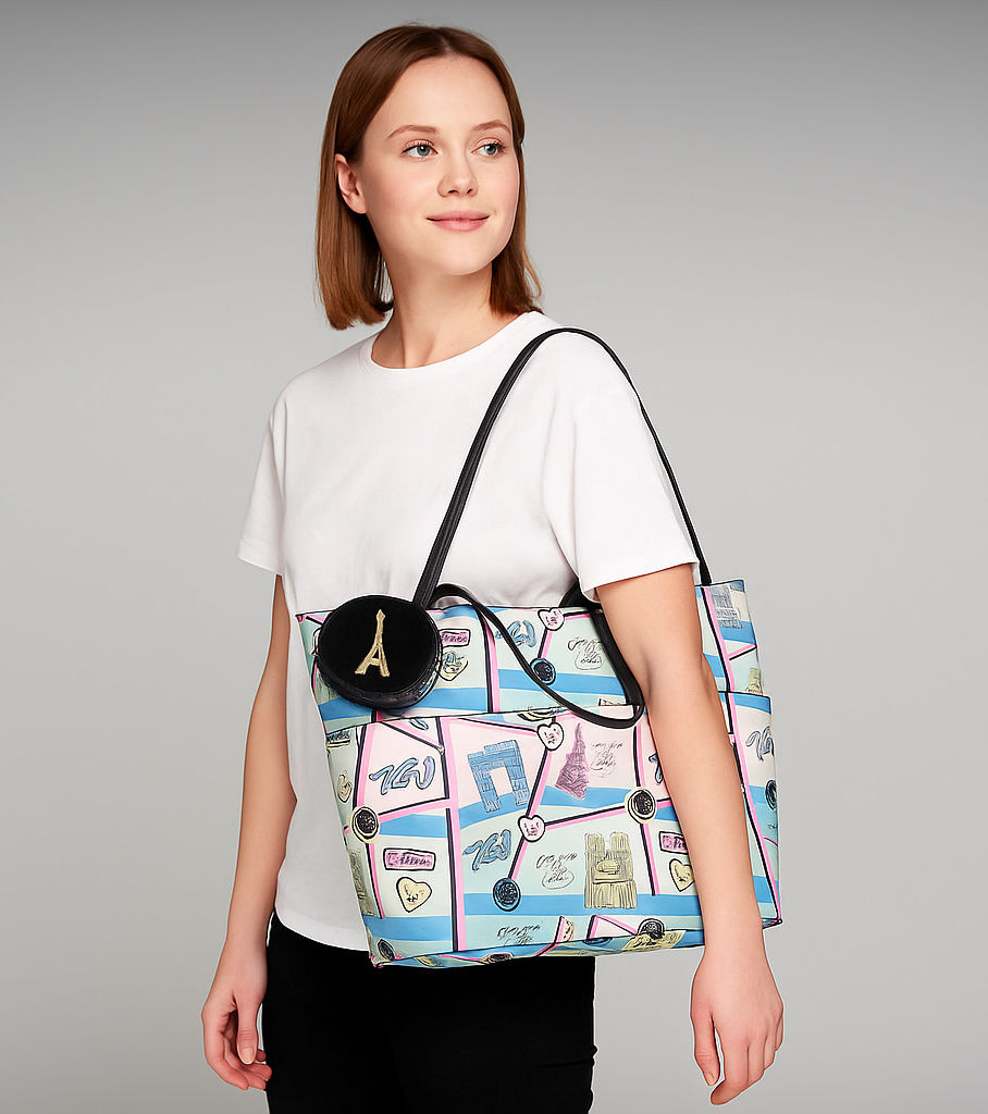 Proměňte každodenní nošení v cestu po Paříži s touto nápaditou tote kabelkou od Karl Lagerfeld. Unikátní design ve stylu grafické mapy vás provede ulicemi plnými ikonických památek, hravých vzkazů a typického loga "Karl". Svěží paleta barev je v ostrém kontrastu s elegantními černými rukojeťmi, což kabelce dodává moderní a sebevědomý vzhled. Šarmantní tečkou je pak kulatý přívěsek s motivem Eiffelovy věže.