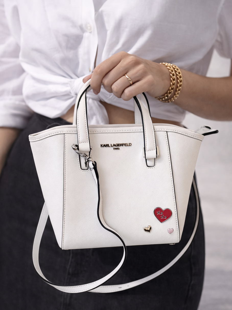 Elegantní kabelka KARL LAGERFELD PARIS v čistém bílém provedení zaujme minimalistickým designem doplněným jemnými romantickými detaily v podobě srdíček. Moderní silueta s pevnými uchy a odnímatelným popruhem umožňuje nosit kabelku jak v ruce, tak přes rameno. Stylový doplněk ideální pro každodenní nošení i elegantní příležitosti.