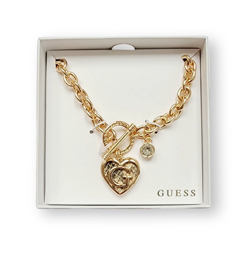 Dominantou náhrdelníku je masivní řetízek ve zlatém odstínu, který dodává celku sofistikovaný a zároveň trendy vzhled. Centrální přívěsek ve tvaru srdce, zdobený ikonickým monogramem „G“ a elegantním hadím vzorem, je symbolem vášně a síly. Jemný, třpytivý krystal dodává náhrdelníku nádech extravagance a zachycuje světlo s každým vaším pohybem.