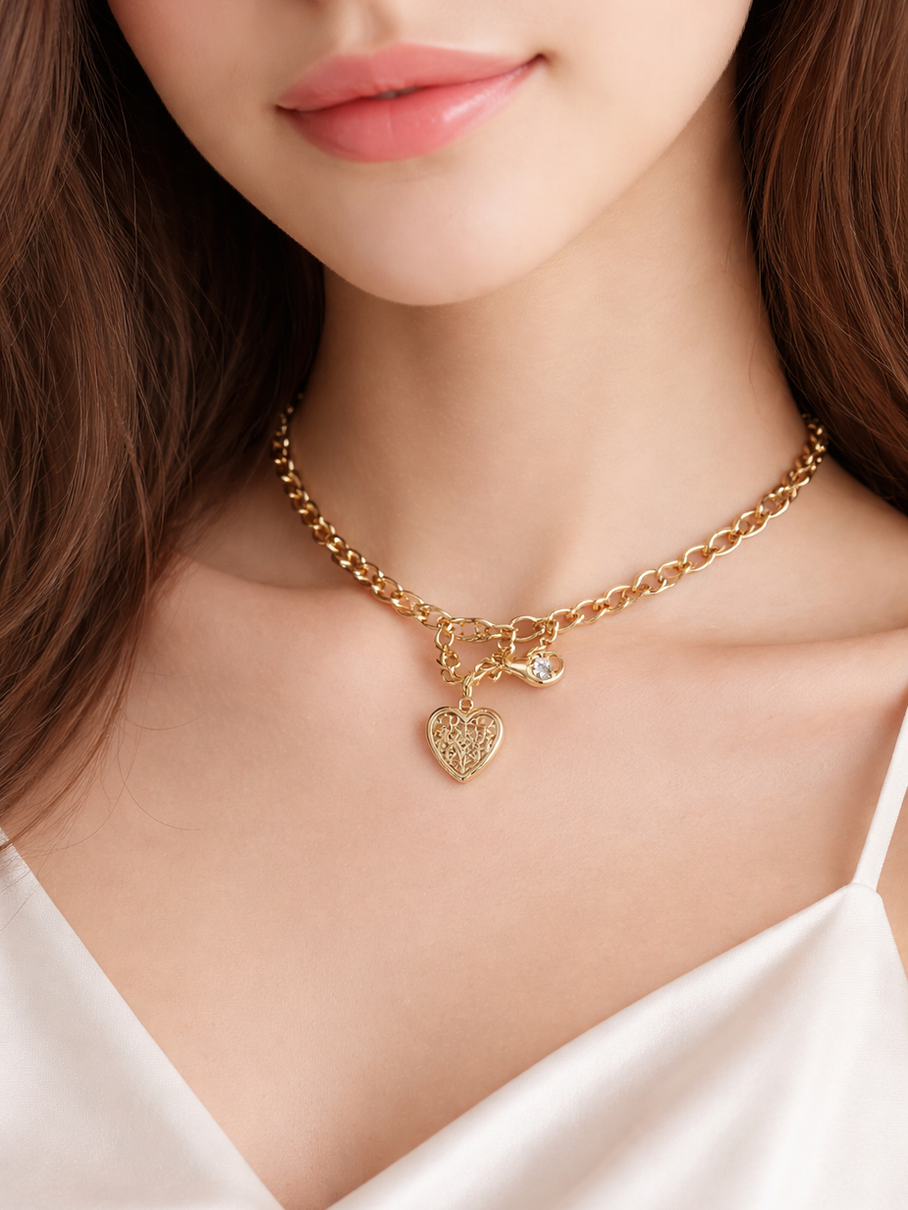 Stylový náhrdelník GUESS ve zlatém tónu zaujme masivním řetězem a výrazným srdíčkovým přívěskem s ikonickým logem značky. Moderní toggle zapínání s třpytivým detailem dodává šperku luxusní a trendový vzhled.