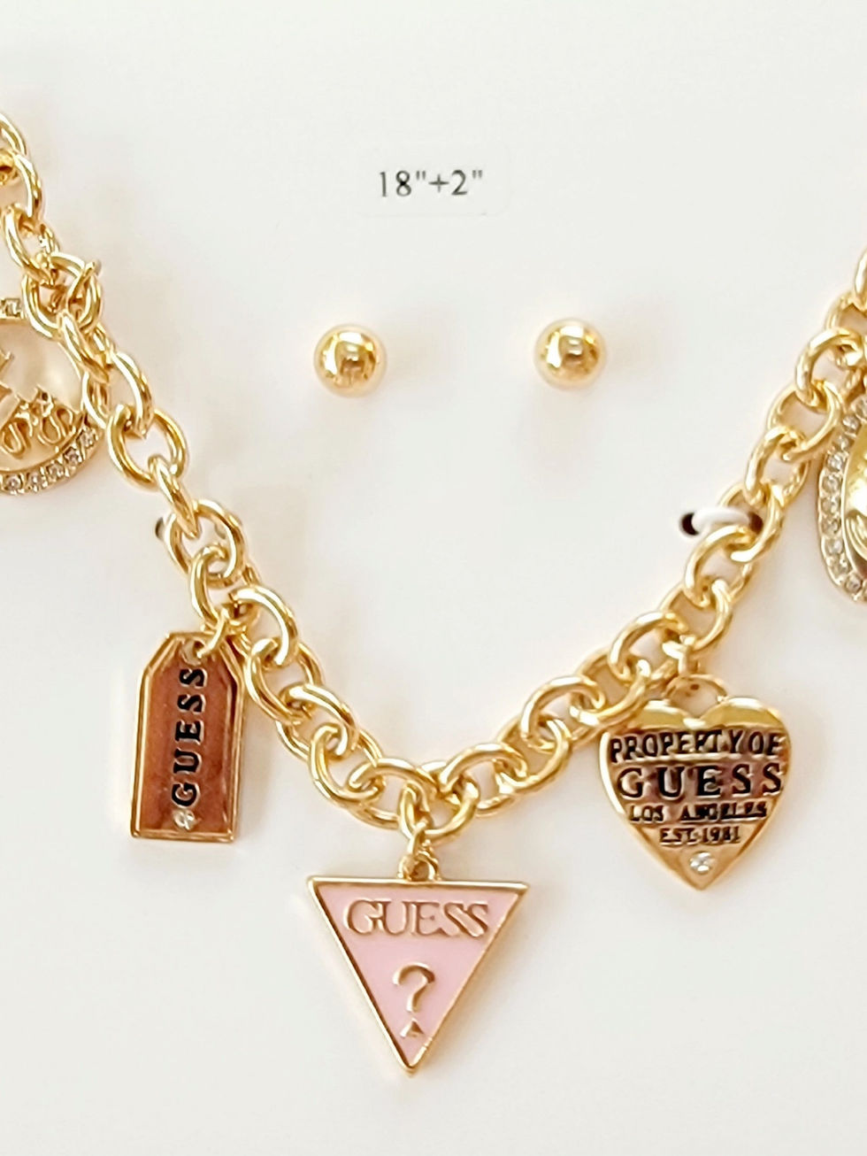 Sada obsahuje náhrdelník a náušnice, které můžete nosit dohromady nebo samostatně. Náhrdelník je ve zlaté barvě a je zdoben několika přívěsky, jako je srdce, trojúhelník a kulatý přívěsek s logem GUESS, které dodávají náhrdelníku jedinečný a hravý vzhled. Náušnice ve tvaru malého kamínku dokonale doplňují celou sadu.