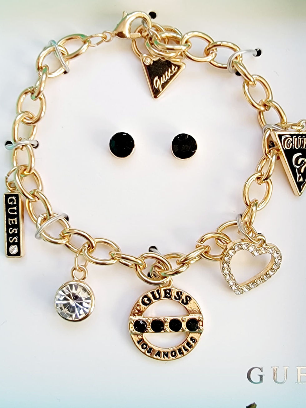 Sada obsahuje náramek a náušnice, které můžete nosit dohromady nebo samostatně. Náramek je ve zlaté barvě a je zdoben několika přívěsky ve tvaru srdce, trojúhelníku a kruhových přívěsků, které dodávají náramku jedinečný a hravý vzhled. Náušnice ve tvaru malého kamínku dokonale doplňují celou sadu.
