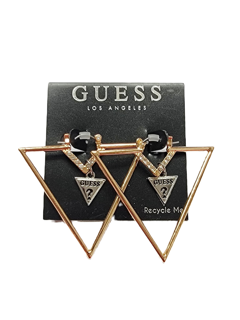 Detaily: Velké zlaté trojúhelníky, menší stříbrné trojúhelníkové přívěsky s logem GUESS, černý kámen a krystalové zdobení v horní části.