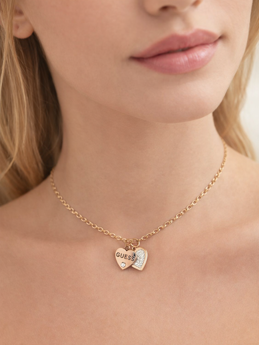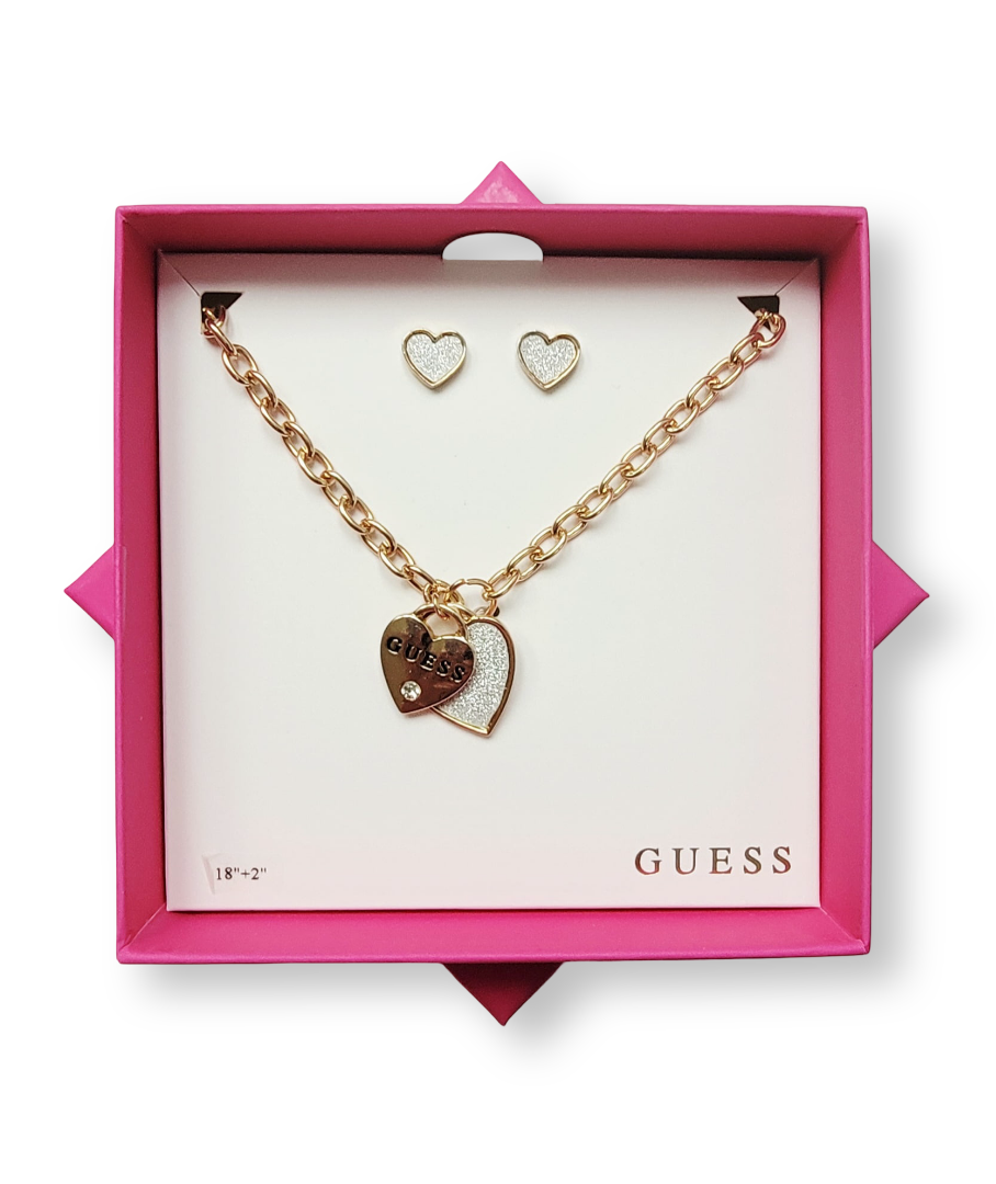 Elegantní zlatý šperkový set GUESS se srdíčkovými přívěsky v kombinaci zlaté a stříbrné barvy. Jemný, ale výrazný doplněk pro každodenní nošení i speciální příležitosti.
