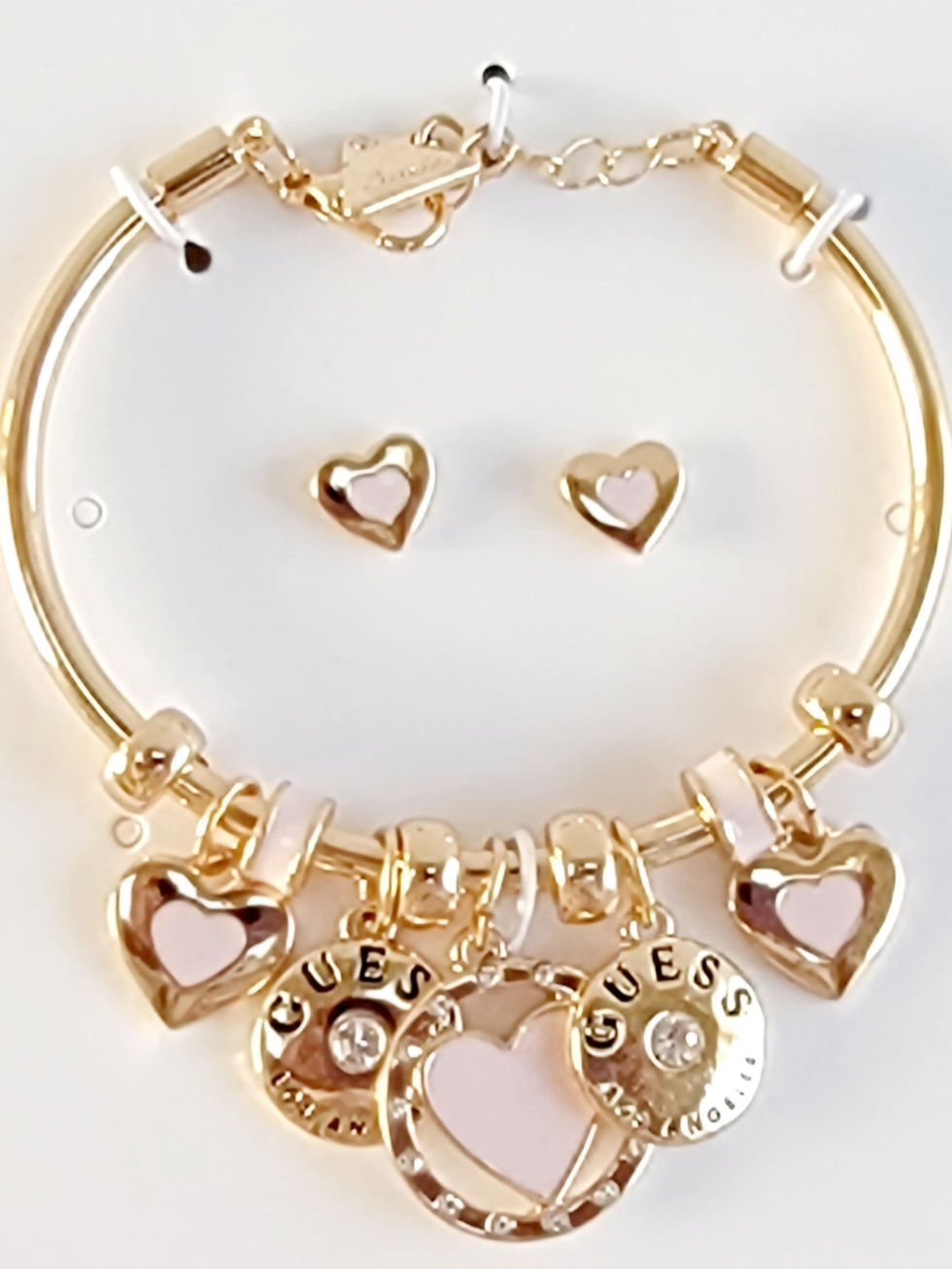Detaily: Sada obsahuje náramek a náušnice Náramek s několika přívěsky ve tvaru srdce a kulatých přívěsků s logem GUESS Náušnice ve tvaru srdce Kvalitní kovové komponenty ve zlaté barvě Styl: Elegantní, moderní, nadčasový, minimalistický Ideální pro: Každodenní nošení, do práce, na schůzky, pro ženy, které ocení prvotřídní design a eleganci.
