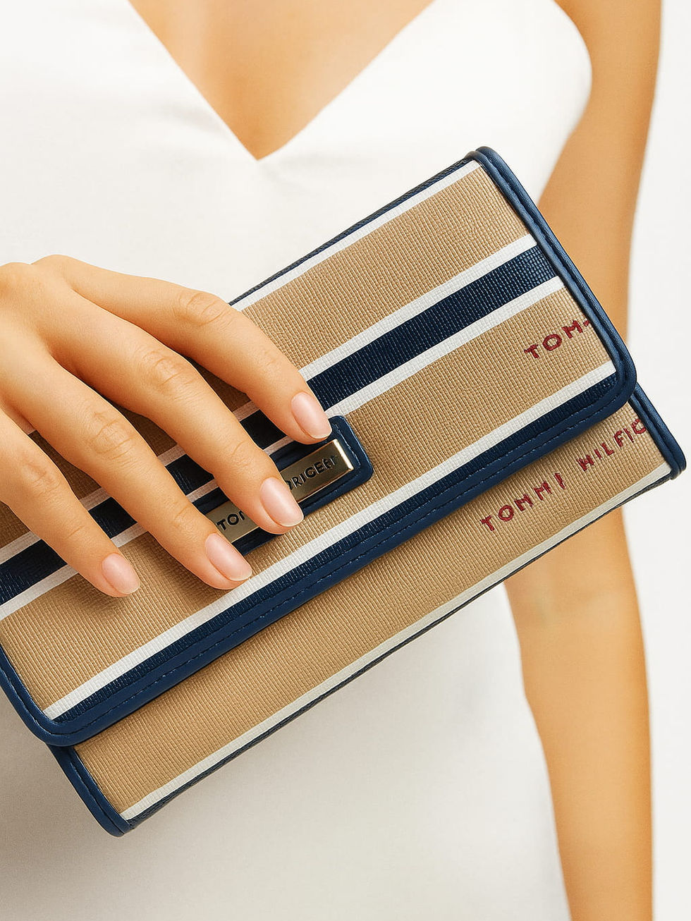 Námořnický šik pro vaše nezbytnosti! Tato elegantní peněženka od TOMMY HILFIGER je dokonalým spojením klasického amerického stylu a nadčasové praktičnosti. Její svěží design s výraznými svislými pruhy v odstínech béžové, námořnické modré a bílé evokuje letní pohodu a přímořskou eleganci. Centrální kovová destička s logem značky dodává peněžence punc originality a luxusu. Vnitřní uspořádání pak zajistí, že všechny vaše karty, bankovky a mince budou mít své místo. Je to ideální doplněk pro ty, kteří milují ikonický preppy styl a chtějí mít své finance stylově a přehledně uspořádané.