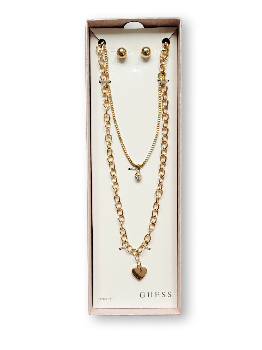 Elegantní set šperků GUESS v zlatém tónu dodá každému outfitu nádech luxusu. Vrstvený náhrdelník s jemným přívěskem a srdíčkem je doplněn o minimalistické peckové náušnice pro dokonale sladěný vzhled.