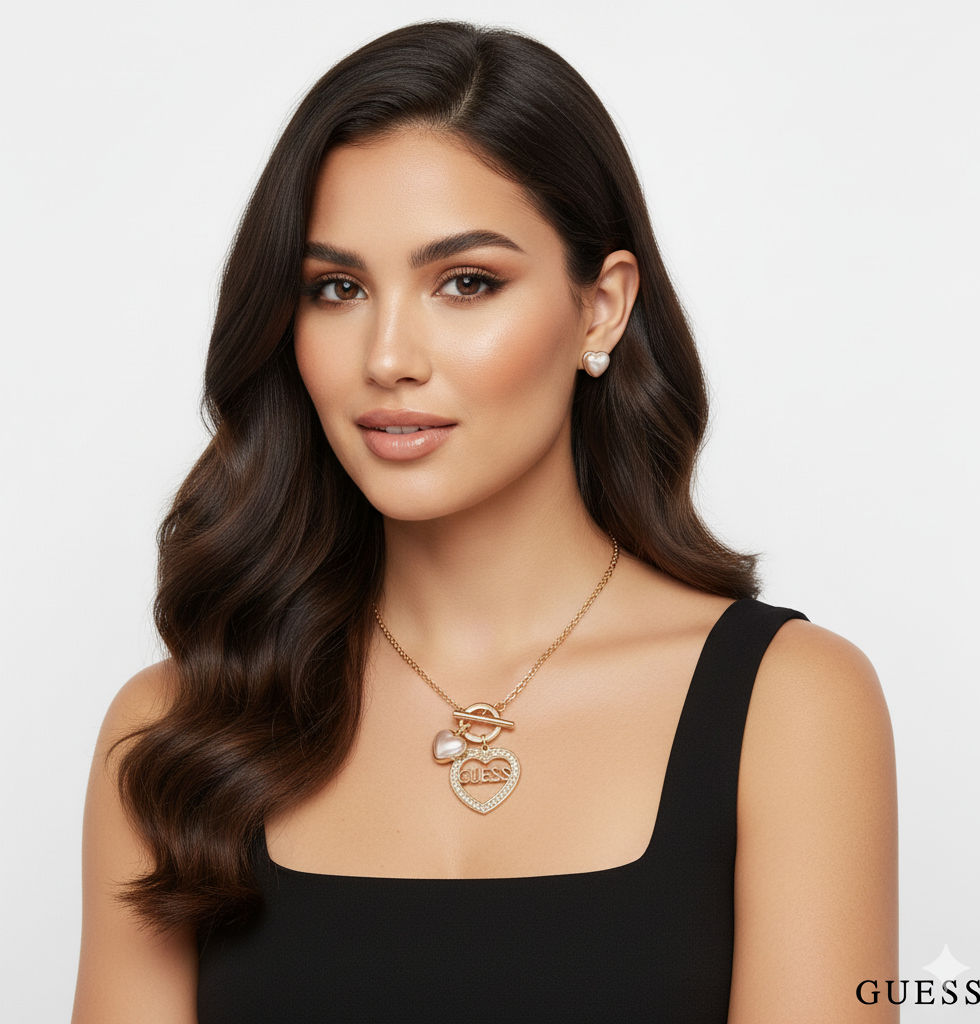 Náhrdelník z masivního řetízku ve zlatém odstínu je dominantou této sady. Na něm se nachází centrální přívěsek ve tvaru srdce, který je bohatě zdoben drobnými třpytivými krystaly, z nichž vystupuje ikonický nápis "GUESS". K němu je elegantně připevněno menší, perleťové srdíčko, které dodává náhrdelníku jemnost a něžný půvab. Praktické zapínání na "T-bar" (tyčka a kroužek) podtrhuje moderní design.