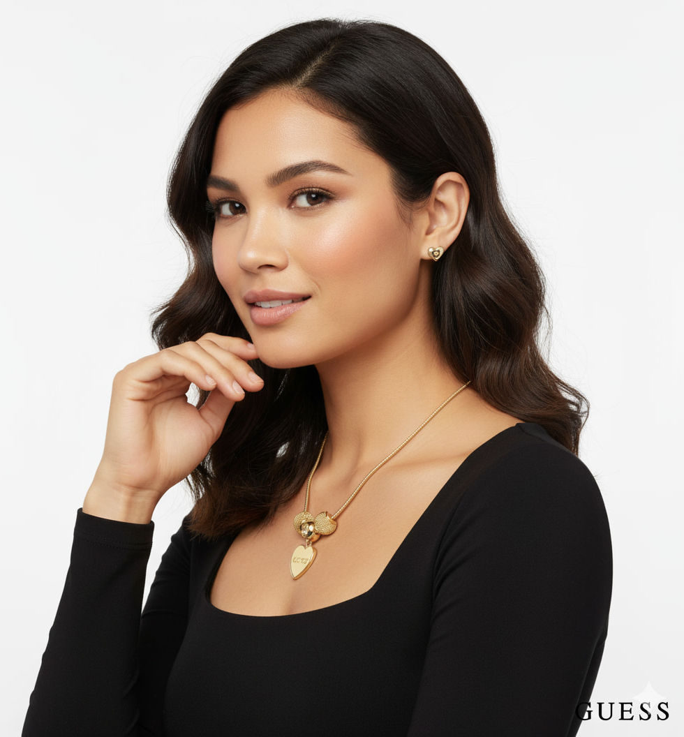 Styl: Elegantní, romantický, třpytivý, luxusní Detaily: Jemný řetízek, přívěsek srdce (pavé osázení krystaly), kulatý přívěsek s logem GUESS, ladící puzetové náušnice ve tvaru srdce. Zapínání náhrdelníku: Bezpečné zapínání na karabinu Zapínání náušnic: Puzetové (na puzetu) Ideální pro: Večerní události, plesy, svatby, romantické večeře. Pro ženu, která chce zazářit a miluje třpytivé doplňky.