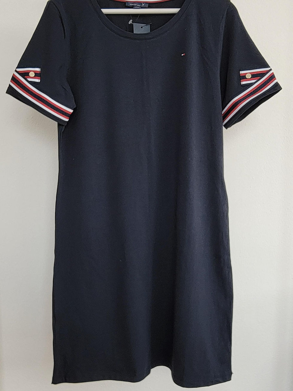 Pohodlí s preppy šarmem! Tyto šik tmavě modré šaty od TOMMY HILFIGER jsou dokonalou kombinací ležérního stylu a ikonických detailů, ideální pro každou ženu, která miluje sportovní eleganci. Jejich klasický, rovný střih s krátkými rukávy zaručuje univerzálnost a celodenní komfort. Výstřih je decentně lemován proužky v barvách značky, které se opakují i na stylových manžetách rukávů, kde jsou navíc doplněny o zlaté kroužky, dodávající šatům námořnický šmrnc. Malé ikonické logo Tommy Hilfiger na hrudi pak dotváří celkový vzhled. Jsou to šaty, které se dají snadno obléknout pro denní nošení, volný čas nebo neformální setkání.